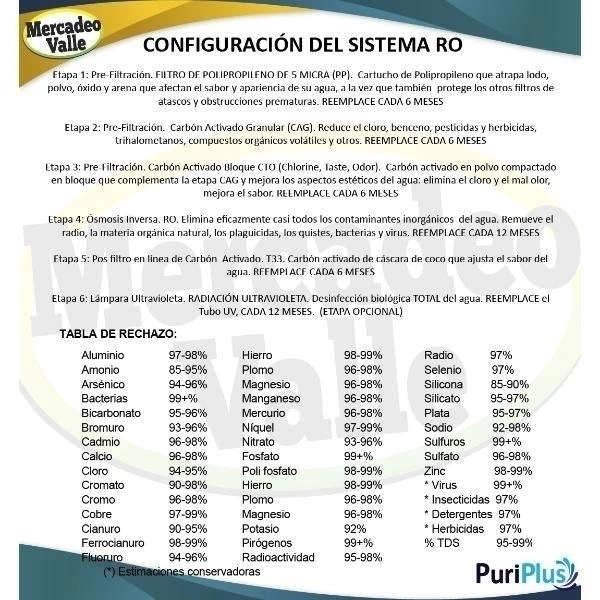 El Filtro de ósmosis inversa de seis (6) etapas con tratamiento con radiación ultravioleta que garantiza agua potable de la mejor calidad, aún de fuentes de agua contaminadas o sin ningún tratamiento como pozos, lagos, arroyos, etc.